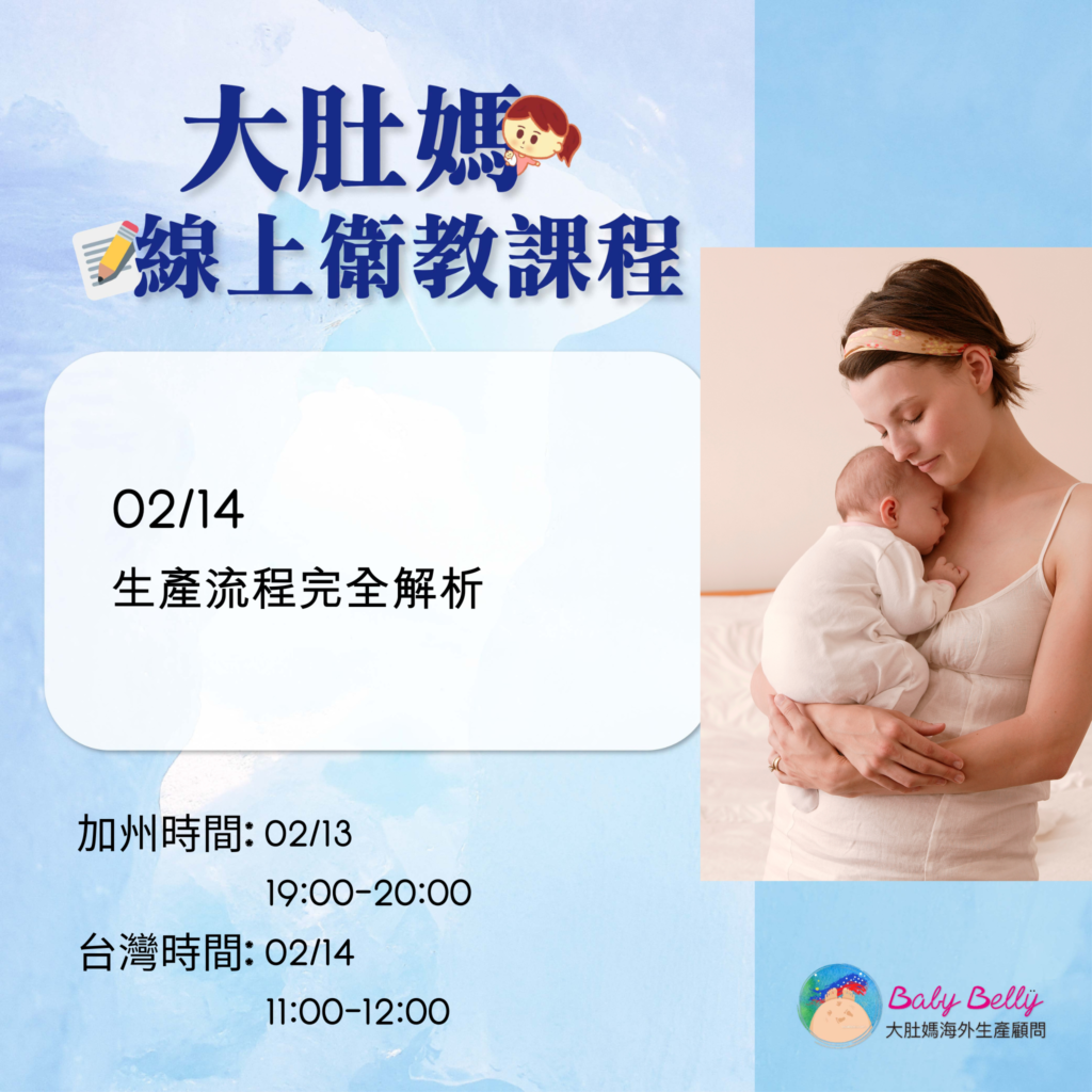 會員服務 大肚媽會員限定,二月份衛教課程 by BabyBelly 2026 年 1 月 20 日 written by BabyBelly 2026 年 1 月 20 日 0 留言 205 大肚媽會員限定!二月份課程時間公布啦! 二月份衛教課程時間: 2/14 生產流程完全解析 本月的大肚媽課程非常適合懷孕後期與各位新手媽咪們,若各位大肚媽會員的爸比媽咪們有時間,歡迎與小幫手報名登記。 一起與我們的衛教講師,了解生產時需要注意的七大重點吧! ※ 大肚媽衛教服務,大肚媽與 婦產專科護理師 黃郁筑 合作,由專業人士,也曾是大肚媽服務過的美寶媽。專為所有大肚媽的客戶服務,提供每個月兩次的衛教課程,以及Line衛教頻道即時詢問,搭配美國本身診所助理,成為全天無休健康防護網,讓媽媽放心、安心前往美國! #大肚媽海外諮詢#大肚媽會員卡#大肚媽衛教課程#大肚媽專屬#美國生子#海外生產 Share 0 FacebookTwitterPinterestThreadsBlueskyEmail 上一篇 【加拿大生子新熱點】為什麼越來越多媽咪選擇「蒙特婁」? 下一篇 從焦慮到不捨離去:B媽咪的美國生產圓夢之旅(含海倫醫師與醫院實況分享) 其他人也關注 大肚媽會員限定,十月份衛教課程 2025 年 9 月 24 日 美加海外資源 2025 年 4 月 15 日 大肚媽美國報稅、稅法講座來囉! 2024 年 3 月 18 日 3/10衛教課程-母乳哺餵非難事 2024 年 3 月 19 日 返台美寶的保險要怎麼規劃?健保半年才有~... 2021 年 6 月 28 日 2023 的最後一天,媽媽們選擇一起參加... 2024 年 1 月 6 日 2026 北部春季團聚:我們不辦海外生產... 2026 年 3 月 24 日 大肚媽會員限定,三月份衛教課程 2026 年 2 月 24 日 大肚媽會員限定,七月衛教課程 2025 年 6 月 27 日 大肚媽3/16校友講座 2024 年 3 月 25 日 請留言 取消回覆